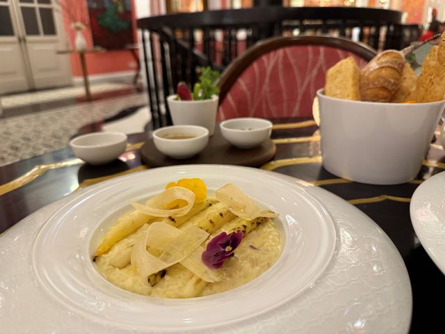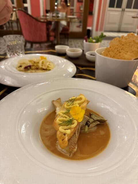 プラにはリゾットと、白身魚のグリル。ソースがブイヤベースみたいで美味しかったです。