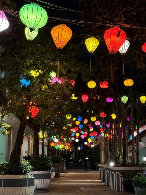 真っ暗な道にカラフルなランタンが下がる道を歩いてポーターさんのいる場所まで。