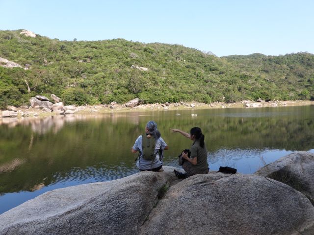 岩に腰を下ろして、対岸からクロアシドゥクラングールを見るのです。かなり遠いので、彼女は双眼鏡を持ってきてくれてました。