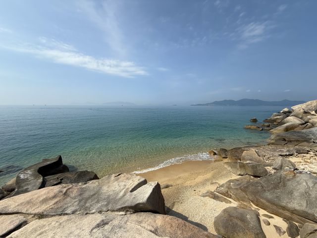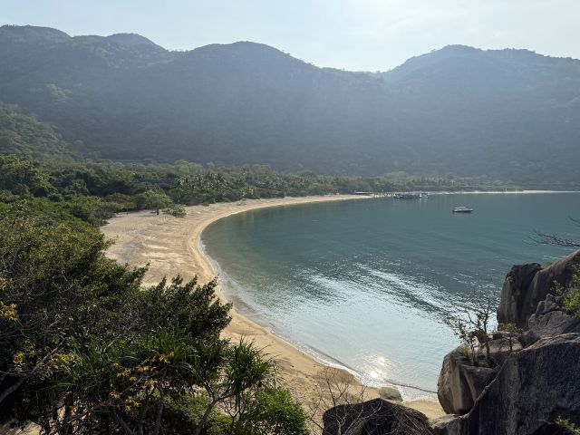 途中の開けた場所で振り返れば、弧を描いたビーチが見えた。結構登ってきたなぁ~~~