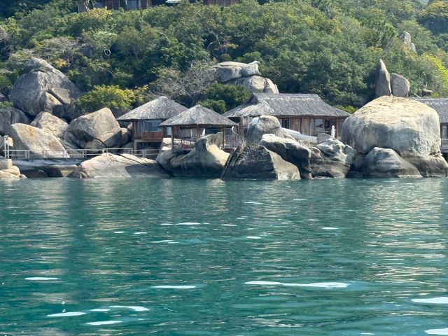 帰りは、来た道を戻るのではなく、貯水湖からすぐのビーチからボートに乗ってリゾートへ戻ります。