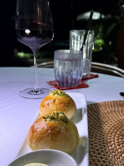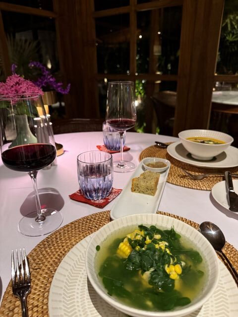 スターター、Benoitは昨晩と同じかぼちゃのスープ。私はコーンとワカメのスープ。