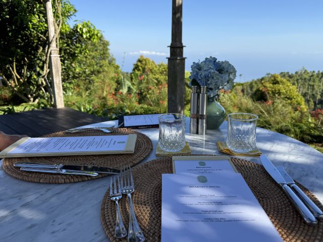 2度目の朝も藤棚の下に一度座ったのだけど、この朝は虫がかなり多く発生していたので、テラス席に移動。