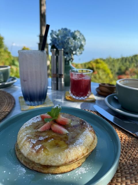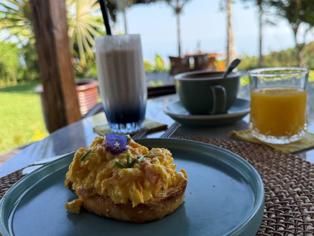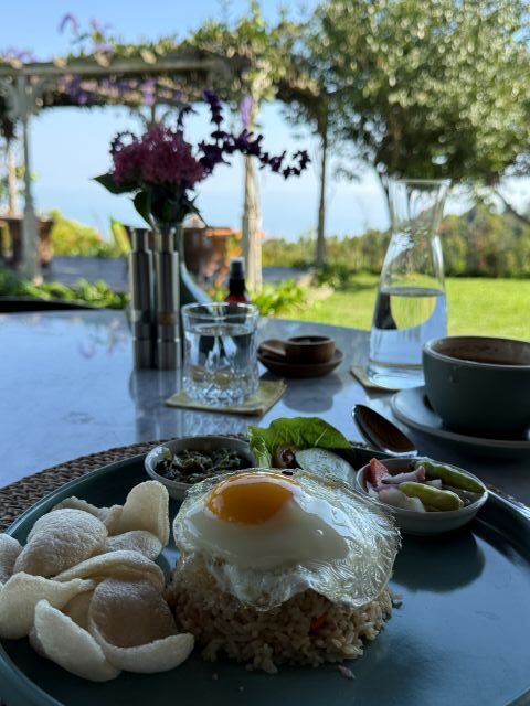 私はナシゴレン。この日はウルワツのヴィラに戻る日で、帰りの道中では滝に寄ったりライスフィールドに寄ったりするので、エネルギーが必要。インドネシアの定番食だけど美味しい。