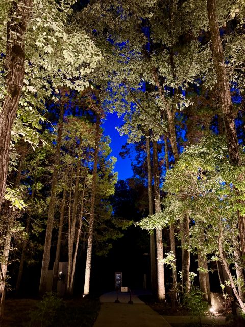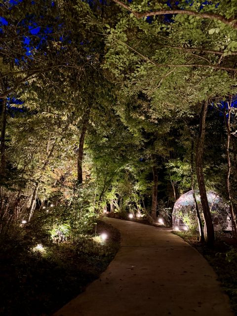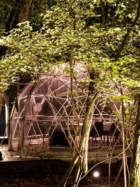 丁度、昼と夜の境目、ブルーモーメントと重なって、施設内の灯りと森の木々が綺麗